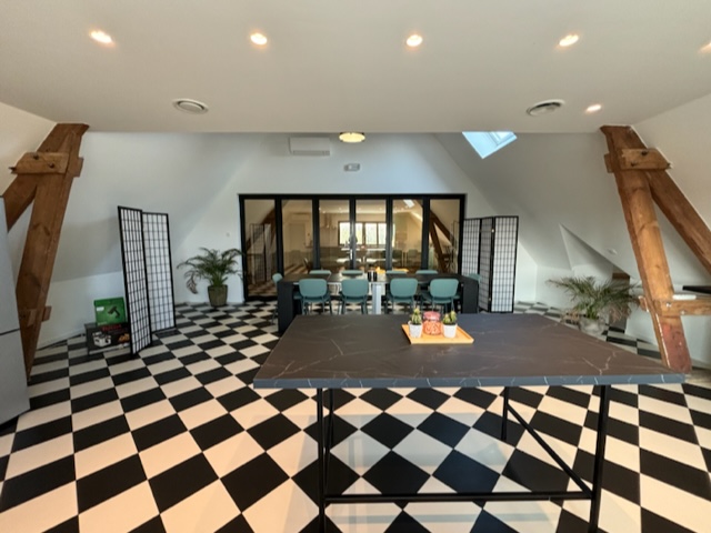 700 m² dans une église rénovée : hauts plafonds, lumière naturelle, vitraux colorés. Un lieu chargé d'histoire qui inspire le travail et la créativité.