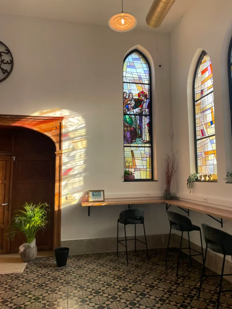 Elle a cherché longtemps avant de trouver le bâtiment idéal. Une ancienne église désacralisée à Frameries. Hauts plafonds, lumière naturelle, vitraux colorés, charme de l'ancien. Un espace chargé d'histoire, prêt à devenir un cœur battant pour la communauté locale.